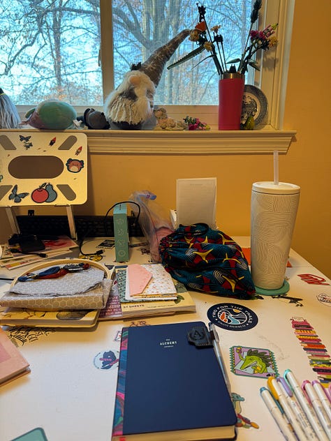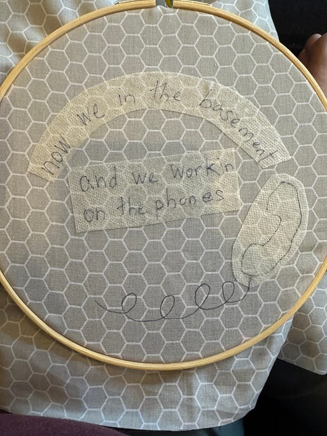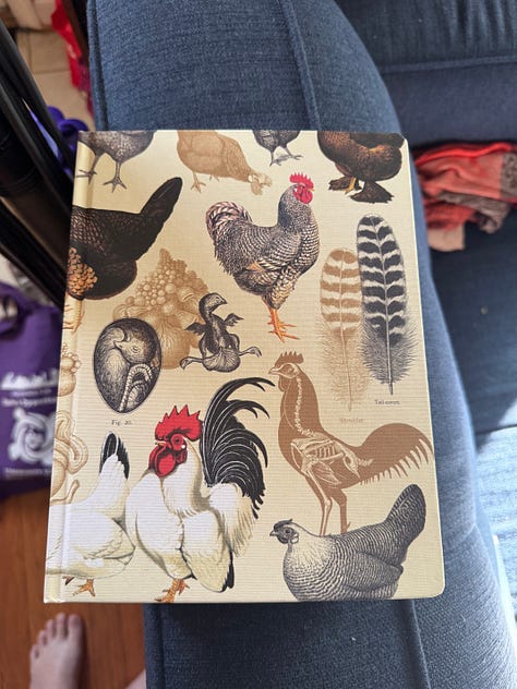 I could write about how I have so many different ideas for projects that I want to do but am only working for on one knitting WIP. It’s a Baby Surprise Jacket which I don’t remember when I last made one of. How I am thinking of starting a sort of junk journal that would back and forth amongst some friends in this crazy chicken notebook. (But that seems like something for middle schoolers so it may stay fully in my possession.) That I have traced out these song lyrics for a friend of a friend who just got his first office job. I would have started on the stitching part but forgot to grab the needles before it was time for bed last night.