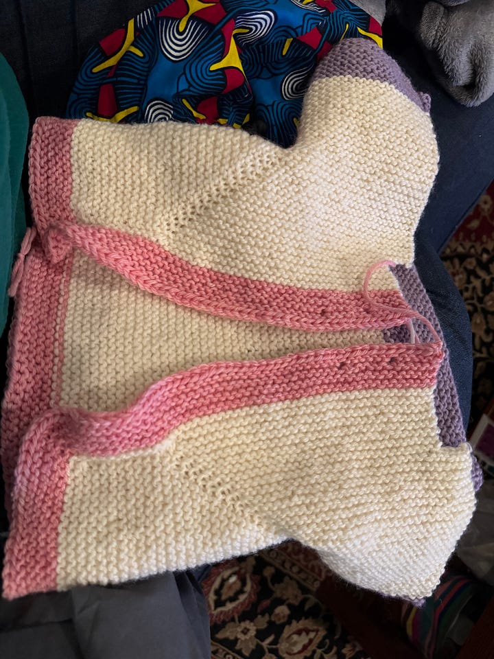 I’ve been doing some knitting which has been nice. I made a baby sweater for a coworker and finally finished up some socks I started back in August; I used the Baby Surprise Jacket (link to publisher’s page for book it was published in) from Elizabeth Zimmermann and Monkey (link to Knitty) from Chloe A., respectfully.
