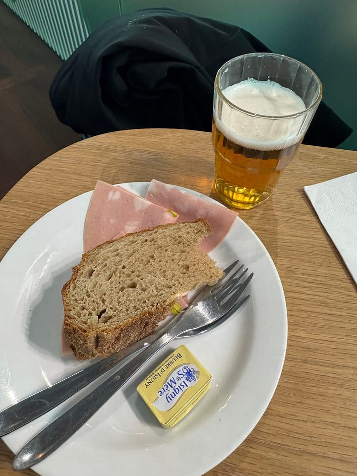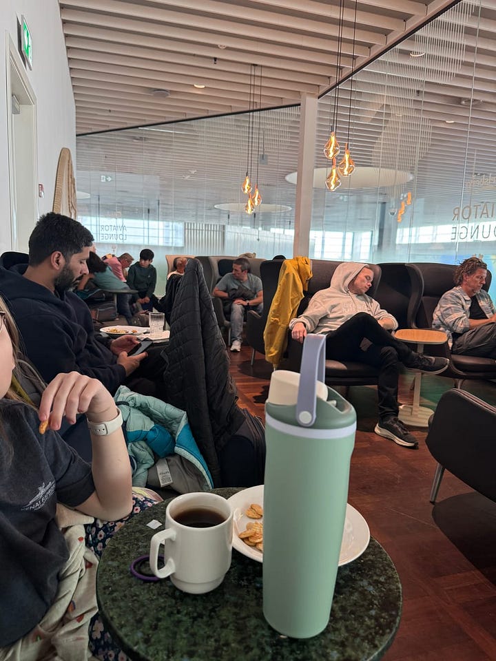 Our route took us through the Copenhagen airport with a nearly 5 hour layover. Of course, passport control and customs took less than 10 minutes in total so we were left with a ton of time to kill. We wandered, sat on a bench in an atrium where you could get assistance if you were disabled, wandered more, and sat on another random bench until it was 3 hours before our flight. Why the 3 hours? That’s when we were able to enter the Carlsberg Aviator Lounge (thank you, fancy travel card!). We found seats then helped ourselves to the variety of foods and drinks available. Lizzy, unsurprisingly for anyone who knows her, snacked on cheese and crackers and drank some herbal tea. I had bread, cold cuts, cheese, coffee, and non-alcoholic Carlsberg (good, not great, but amazing for being included). Eventually, headed to the gate where there wasn’t half the seating needed. [A lack of enough seating is very common in European airports where security screenings are quick enough to not need to arrive at an airport hours early in order to not miss your flight.]