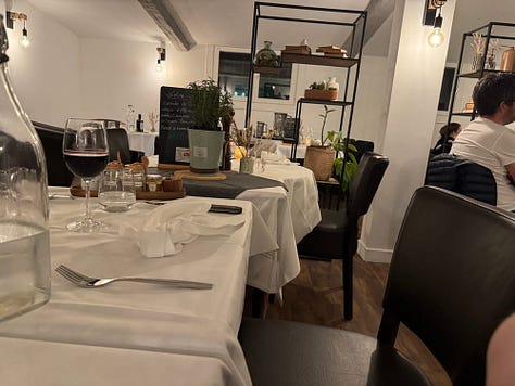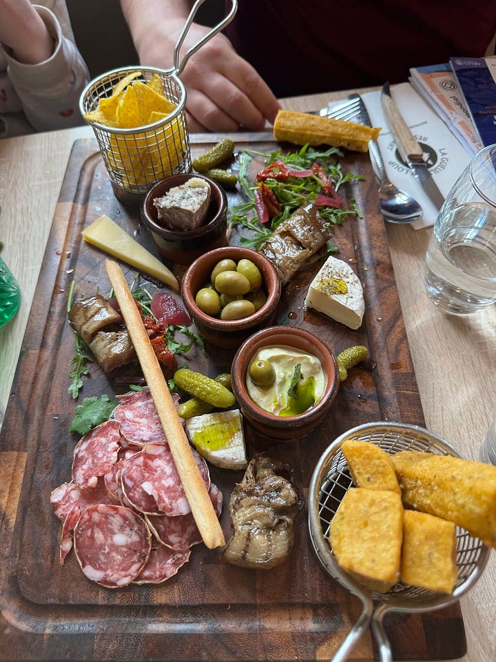 Lunch was at a restaurant that Matt had booked us a reservation at in advance. We decided to order the appetizer sampler which included not only cheese, meats, bread, and olives but also panisse, fried chick pea fritters which are a Provence specialty (recipe from David Lebovitz is here that I’ve not tried but will soon). I wasn’t super hungry so ordered a seared tuna with rice noodles starter. Matt got the special main of the day, cuttlefish. Lizzy finished her meal with the cheese plate.