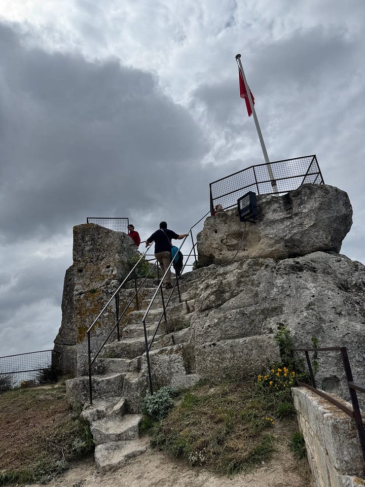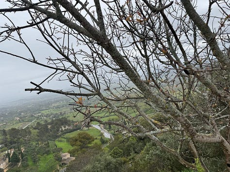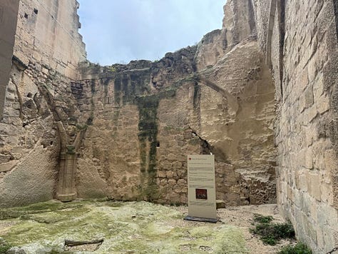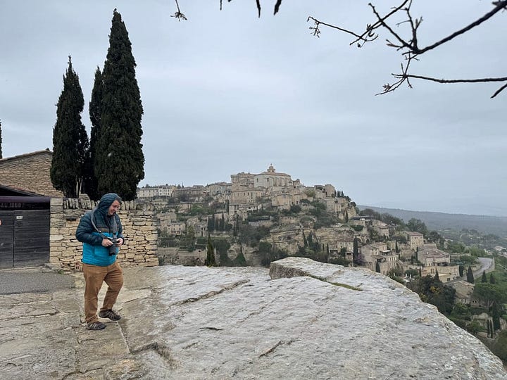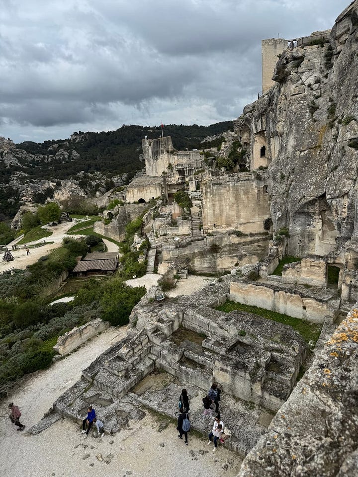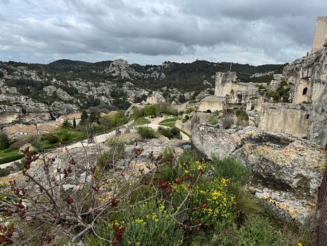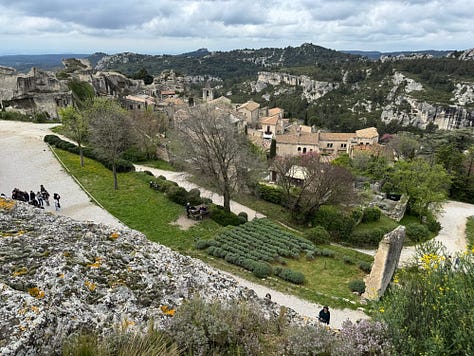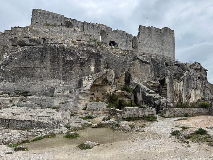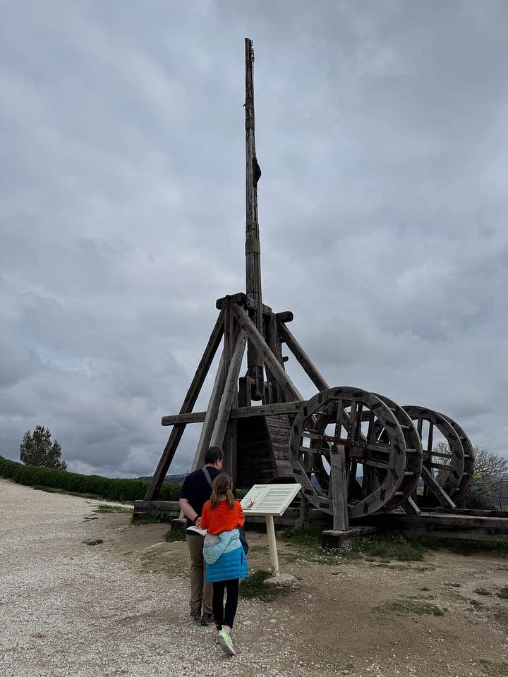After lunch, we headed back to Baux which you may have heard of as it’s where Bauxite was first found; you can even look and touch a sample of the stuff in this very touristy little town that has a castle at the top. We got really lucky with parking, finding a spot maybe a quarter mile from the town entrance. Up the longggg hill to the destroyed castle. It was fun to get to go wherever it was safe to do so which meant lots of tower climbing for Matt and Lizzy. I like seeing the siege weapons they had on display. After, we wandered past the little shops and managed to find the same shop we’d gotten a bowl from back in 2011, only to find out the lavender pattern Matt loves so much is no longer being made. (We did manage to get one small bowl with that pattern plus one with lemons on it and a dish designed for deviled eggs or “oeufs mimosa“ which is similar.
