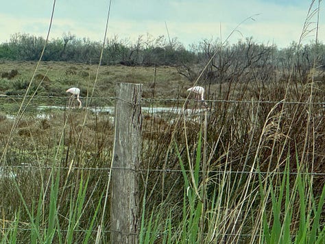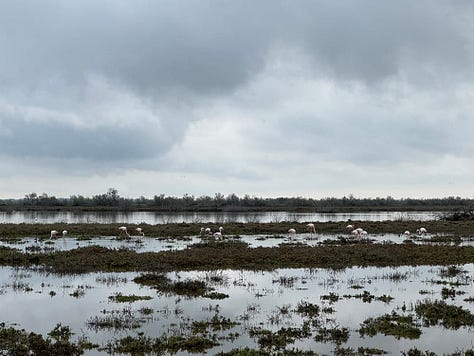 Did you know that Provence is home to tons of wild flamingos? Well, it is! You’ll find them in the wetlands of the Camarogue National Park. There are no fees associated with visiting them, not even parking fees, just a drive through the area. With all of the rain that was falling that day and the day prior, some parts of the wetland were flooded and/or uneven. Matt wanted to look out for the flamingos and other wildlife, so I took over the driving. Wound up being my old time driving the entire trip.