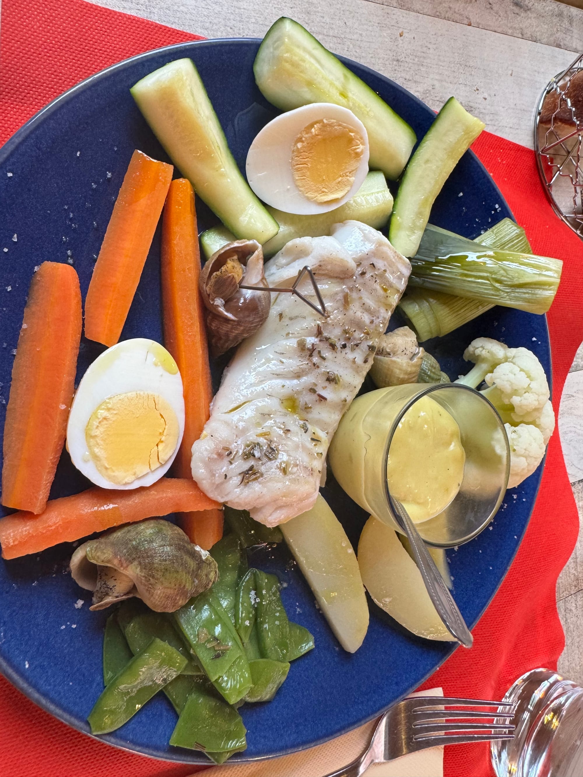 We ate lunch first at a place that had a lovely heated and covered from the rain terrace. I had the grand aioli which was a ton of vegetables with cod and whelks, all designed to dipped or covered in the homemade garlic mayonnaise. Lizzy was happy to have a kids meal of chicken nuggets, fries, sirop (water with flavoring, in this case, grenadine), and an ice cream bar. Matt had a lamb stew then chocolate lava cake. After lunch, we walked around town and found a store that makes its own water colors and you can either buy them pre-made and dried on a palette or in powdered form to be mixed with your choice of liquid later. Outside of town, we visited two wineries - one very basic with tastings in an old building, the other very fancy. The second make two sparking non-alcoholic wines and, for the first time ever, I was able to try them!