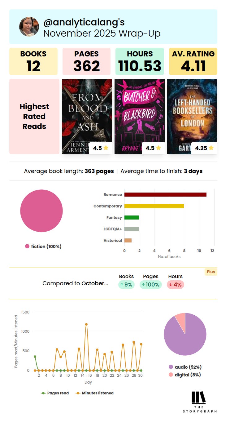 First, I read book 1 and listened to book 2 of the Ruinous Love trilogy from Brynne Weaver. Yes, these books earn all of their trigger/content warnings as they both involve people who are killers and feature steamy scenes. While they certainly have lots of dark scenes, there is humor and banter mixed in, too. I’m waiting not so patiently for the third book in audio from the library though I may give in and use my December Libro.FM credit to get it or, you know, read the actual book that’s available right now at my local branch. Butcher & Blackbird was a 4.5 for me and Leather & Lark a 4.25.