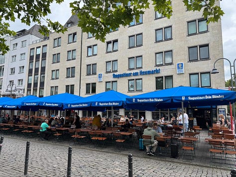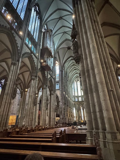 After killing some time in the train station, it was time to take our longer train (about 2 hours) to Köln. No quiet car this time. I enjoyed the time to do some journaling and relaxed. Upon arrival Köln, we walked to our hotel to drop things off and eventually went out to a beer hall. Turns out, Kolsch beer is from Köln and they serve it in small, 0.2 L (about 7 oz) portions so you beer is always ice cold. (They have an N/A version in 0.33 L bottles.)
