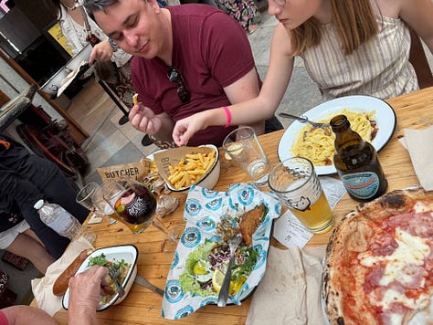 Of zero surprise to anyone, we went on the walking tour of town after depositing our bags into lockers in the train station. Our wandering took us to a really neat looking shopping mall that reminded me of the shopping arcades in Paris. Lunch was at our first food fall / food court of the trip where we all got to chose what we wanted to eat - garlic shrimp and sangria for my mom, pizza and AMAZING samosas for me, pastrami (yes, really) sandwich for Matt, and carbonara for Lizzy.